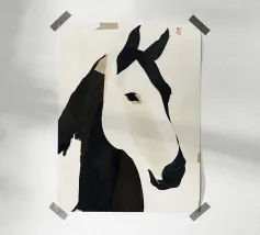 Horse's head in black ink with gold paint and oil pastels for the mauve background.