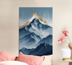This visually arresting depiction of K2 uses bold angular forms that mimic the rugged geometric contours of this towering peak. Shrouded in dark, stormy skies, the mountain commands attention with its jagged edges and illuminated ridges, creating a dramatic contrast of light and shadow. The golden accents along the base of the slopes add a striking dimension, symbolizing a path through chaos. This artistic approach turns K2 into an abstract monument of nature's unrelenting power and splendor.