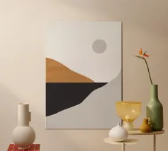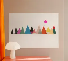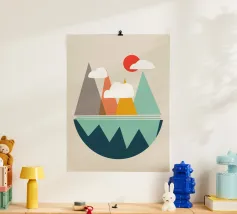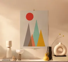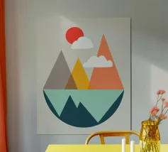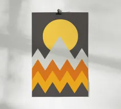 Geometric shapes form a minimalist mountain landscape with a circle above resembling the sun. An inverted reflection of the peaks is depicted below, creating a symmetrical design.