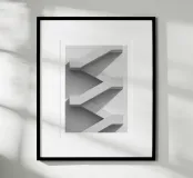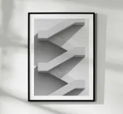 Black and white poster of minimalist architecture: zigzagging external staircase, attached to a light façade and cut by low-angled light that casts long graphic shadows. Clean lines, textured concrete and a repetitive rhythm create a hypnotic geometric image. An elegant wall poster for the living room, office or hallway, it brings relief, modernity and balance to contemporary, Scandinavian, industrial or Japandi decors.
