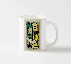 This highly abstract tapestry by Fernand Léger showcases his characteristic use of strong black outlines and bold primary and secondary colors. The composition features thick, winding forms reminiscent of a treble clef or musical notation, set against blocks of color and white brick-like patterns. The work reflects Léger's lifelong exploration of pure form and color.