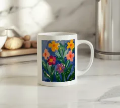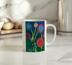 A vibrant, abstract garden scene rendered as a patchwork of dotted and patterned flowers against a dark background. The artwork is a joyful and imaginative interpretation of a blooming garden.