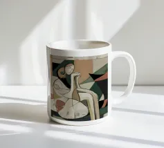 This artwork depicts an abstract figure in a seated pose, surrounded by geometric shapes and muted colors. The use of beige, brown, and black tones creates a sense of depth and complexity. The figure's posture and the abstract elements within the composition invite the viewer to reflect on the meaning and emotions conveyed by the artwork.