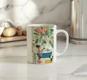 This image shows a person taking a bath in a tub surrounded by plants and a cat, with a cup and book nearby. The cozy and tranquil atmosphere makes it a comforting and pleasant scene.
