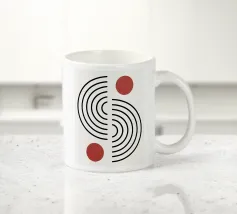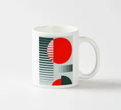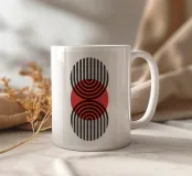 A bold Bauhaus-inspired abstract design featuring layered red circles and rhythmic black vertical lines. A striking modern statement piece perfect for contemporary interiors.