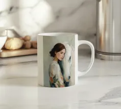 A black-and-white surreal image of a woman in a lace dress facing a giant horse head with cracked textures, creating a dreamlike, thought-provoking atmosphere against a cloudy sky.