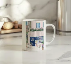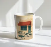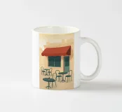 Minimalist design of a typical small French corner café with small round tables, red awning and cute table plant. Decorative design for all those who like delicious coffee in beautiful cafés.