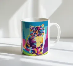A vibrant geometric illustration of a sitting cat featuring overlapping shapes in dynamic colors, paired with abstract leafy elements for a modern, creative design.