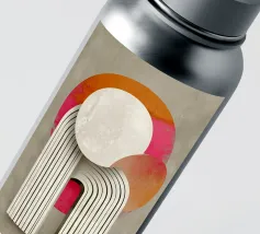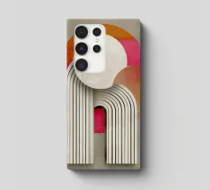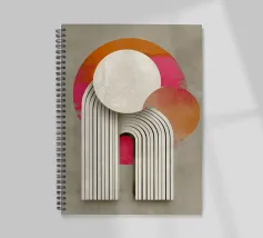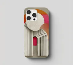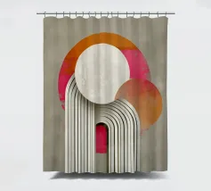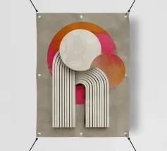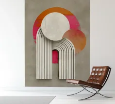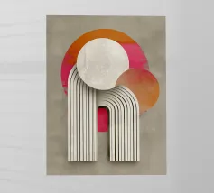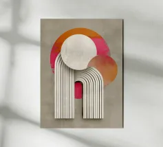 This abstract Bauhaus inspiration combines geometry and symmetry in a modern design. With circles, semi-circles and stripes in grey, orange and pink, the illustration creates a harmonious interplay of colours. The retro-architectural shapes give the artwork a minimalist and structured aesthetic.