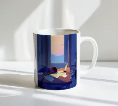 This painting depicts a person sitting at a desk with various plants and art supplies. The person is wearing a yellow plaid shirt and appears to be deep in thought, looking out the window at a colorful sunset. A black cat is perched on the windowsill, adding a touch of whimsy to the scene.