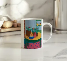 A quirky desk with pink lamp, vase flowers, matryoshka, and tea brings playful personality.