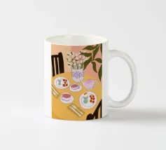 A simple, modern interior scene of a table set for two, with a vase of flowers as a centerpiece. The yellow wall and minimalist setting create an atmosphere of quiet intimacy and chic simplicity.