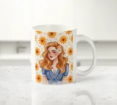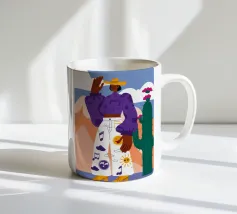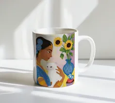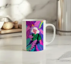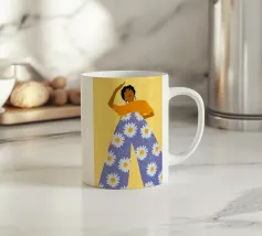 This artwork depicts a person in a vibrant yellow floral top and blue pants, striking a dynamic pose against a pink background with orange floral patterns.