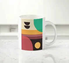 A geometric composition features a stylized orange fish against a backdrop of colored rectangles and circles, blending teal, black, and green shades. Bold shapes and contrasting colors create a modern, abstract aesthetic.