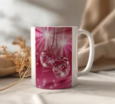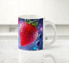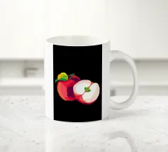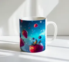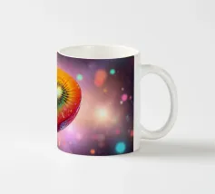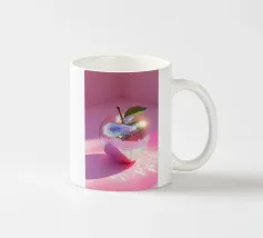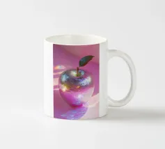 Glossy apples with a vibrant cosmic design float against a colorful background filled with sparkling lights.
