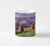 A serene landscape centered on a well-formed haystack standing in a field characterized by gently rolling hills in muted shades of purple and green, all under a soft, calm sky.