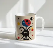 A whimsical and abstract depiction features a cheerful creature with a round body and multiple limbs, surrounded by colorful geometric shapes and playful lines. The vibrant primary colors create a lively and dynamic composition on a neutral background.