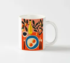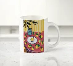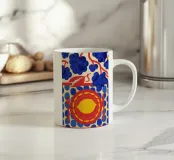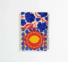 A bold, graphic pattern featuring a lemon sun motif, blue grapes or flowers, and red shapes. The style is modern and has a pop art feel.