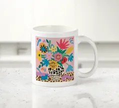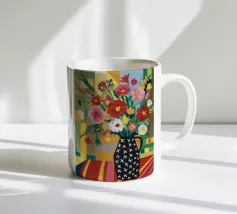 A vibrant bouquet of colorful flowers is arranged in a vase decorated with a patchwork of different patterns, creating a unique and artistic floral still life.