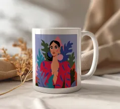 This artwork shows a person wearing a shirt with a geometric pattern, set against a background of green leaves. The focus is on the intricate design of the shirt and the natural elements surrounding it.