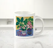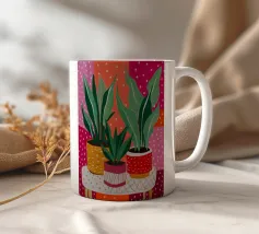 Several potted plants with vibrant flowers and leaves, in uniquely patterned pots, arranged on a surface with a patterned cloth, creating a rich textural and colorful display.