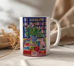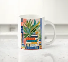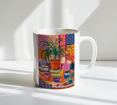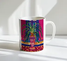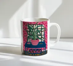 A still life of a potted plant and other objects on a table with a colorful, patterned rug underneath. The composition against a pink wall is modern, eclectic, and full of charming, decorative detail.