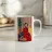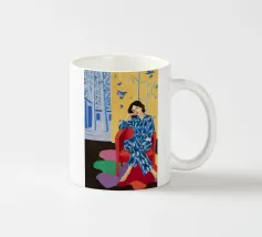 A woman in a red bird print robe sits in a patterned room holding coffee with a quiet yet graphic presence.