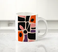 A dynamic abstract composition features bold, rhythmic shapes, spirals, and patterns in a vibrant palette of reds, pinks, blues, and black, creating an energetic and visually stimulating piece.