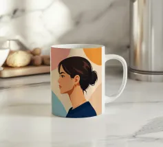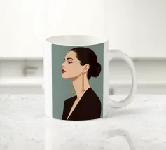 This highly elegant profile portrait showcases a woman with rich, ruby red hair meticulously styled into a bun. Her thoughtful, serene gaze, coupled with a simple gold earring against a soft green background, creates a timeless aura of classic beauty and sophistication.