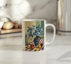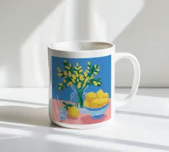 An inviting still life on a bright red table, featuring a bowl of lemons and a blue vase holding delicate white flowers. The warm yellow background enhances the cozy and vibrant atmosphere.