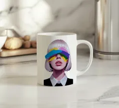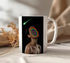 A surreal digital artwork features a woman in a dark hoodie, her face illuminated by vibrant neon light trails. The glowing, multicolored swirls wrap around her head and neck, creating a futuristic and dreamlike atmosphere.