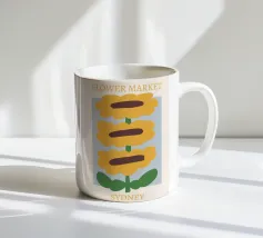 Bright yellow and orange abstract forms resembling a sunflower. Curved shapes and small lines add a dynamic sense of movement to the composition.