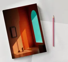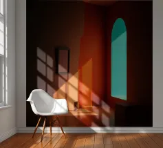 Soft sunlight filters through a turquoise window, casting shadows on orange walls. A clay pot sits on the wooden floor, enhancing the artistic ambiance of the space.