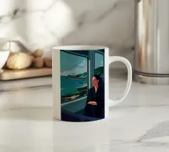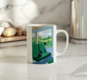 A view from a train window of a green, rolling countryside landscape. The scene is a peaceful, contemplative, and beautiful depiction of travel and the quiet joy of watching the world go by.