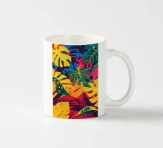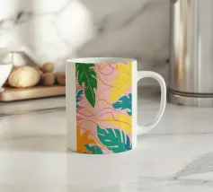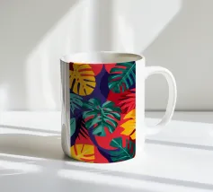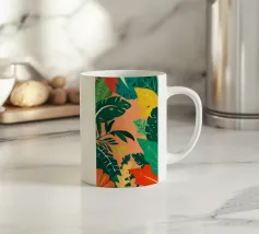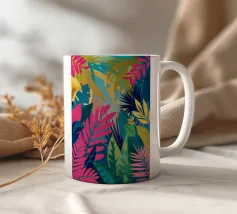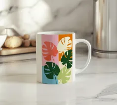 A sophisticated composition combines blocks of tropical leaf patterns with solid color fields and geometric shapes. The patchwork design in shades of blue, pink, and green creates a balanced and stylish piece that is both modern and natural.