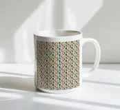 A colorful, repeating pattern consists of abstract shapes in hues of green, yellow, blue, and red. Each element forms a geometric arrangement that creates a vibrant, rhythmic visual effect.