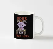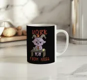 A purple demon goat in a tie sits at a desk with a laptop and coffee, under the phrase “Work From Hell.” The artwork makes a clever pun on daily work feeling like hell, with the demon literally working from hell. Ideal for fans of dark humor, sarcastic office jokes, and anyone who wants to laugh at work struggles.