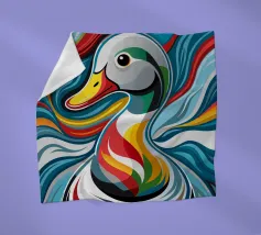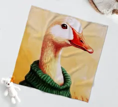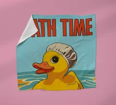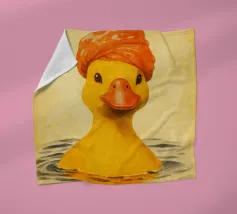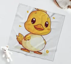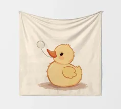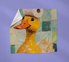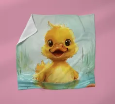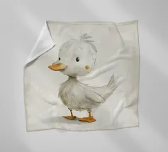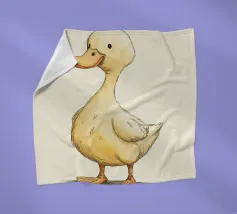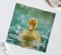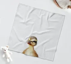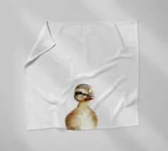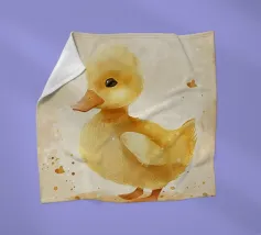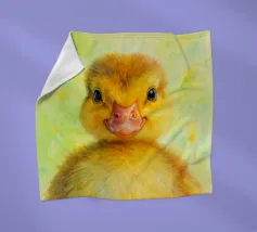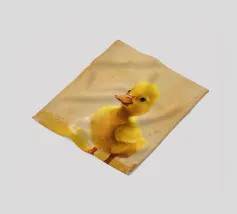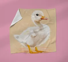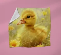 A cute duckling is peeking out from under a soft white towel. Its fluffy yellow feathers and inquisitive eyes create an adorable and charming scene.