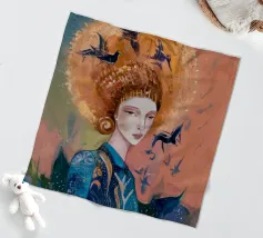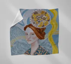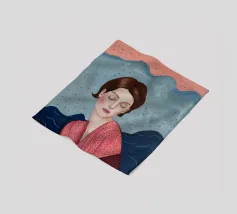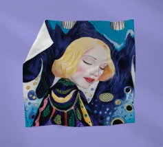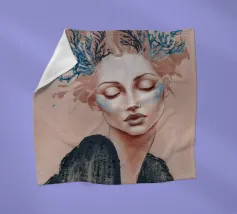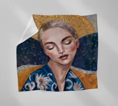 A delicate portrait of a woman with flowing blonde or light brown hair, her eyes closed or looking down, wearing an intricately detailed blue and silver or white garment suggesting lace or armor.