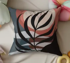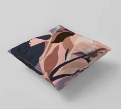 Abstract botanical shapes, including leaves and stems in shades of pink, purple, blue, and beige, are arranged against a dark background. The composition is elegant and modern, focusing on organic forms and color interplay.