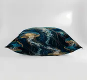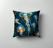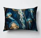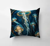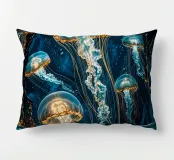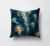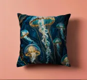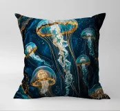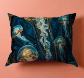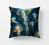 In an underwater realm of sapphire and gold, luminous jellyfish drift gracefully. Their delicate forms shimmer with golden accents, a celestial dance of light and serenity in the ocean's depths.