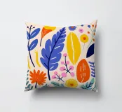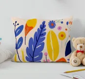 Bright, colorful leaves and flowers are scattered across a light background, creating a lively botanical pattern. The design features bold blues, yellows, reds, and greens, evoking a sense of playful nature.
