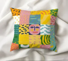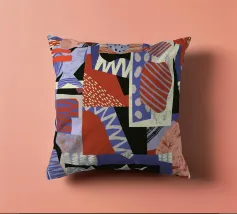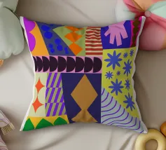 An abstract pattern combines patchwork-like color blocks with energetic scribbles and stripes, creating a dynamic, playful, and artistic design.