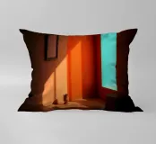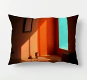 Soft sunlight filters through a turquoise window, casting shadows on orange walls. A clay pot sits on the wooden floor, enhancing the artistic ambiance of the space.