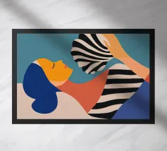 . A striking blend of simplicity and boldness, this artwork captures the essence of femininity with a twist. The vibrant orange background pops against the deep blue sphere, creating a captivating contrast. The figure, with a minimalist white face and alluring red lips, exudes a sense of mystery and strength. It’s like a visual riddle – what’s behind that bold shape? Perfect for those who appreciate abstract art that speaks volumes without saying a word. Ideal for adding a touch of modern elegance to any space