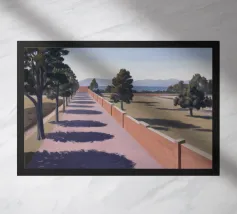 The stark geometry of a covered walkway is defined by bold crimson pillars and the long, sharp shadows they cast in the bright sunlight. This painting is a powerful study of light, shadow, color, and architectural form.