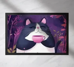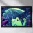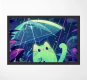 cat umbrella rain plants leaves flowers raindrops neon-glow forest night-sky puddle wet-surface purple-flowers glowing-light cute-animal cartoonish nighttime rainy-weather greenery dark-atmosphere
