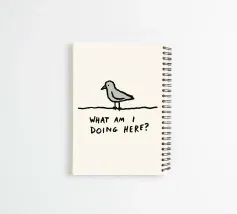 This simple and charming illustration features a small, gray bird perched on a thin black line, set against a plain background. Below the bird, the hand-drawn text poses a universal question: "WHAT AM I DOING HERE?" The artwork beautifully encapsulates feelings of uncertainty, self-reflection, and existential pondering that are relatable to the human experience. The solitary bird, often a symbol of freedom, here becomes a vessel for a moment of quiet introspection, highlighting the fundamental search for purpose and belonging.