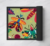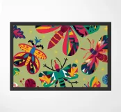The painting features a variety of colorful butterflies and insects against a green background, creating a lively and dynamic composition.