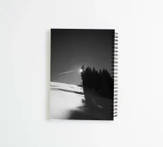 A tranquil black-and-white photograph capturing the sunlight breaking through a dense forest, casting long shadows over a pristine, snow-covered hillside. A minimalist and timeless addition to your wall.